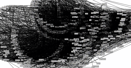 Strumento molto potente per comprende le relazioni tra le parole. Con Lexico3 non si può avere immediatamente accesso a questo strumento. Il programma Coocs, sviluppato da William Martinez, permette di aggirare agilmente questo problema e propone molte applicazioni. Possiamo quindi vedere quali sono le parole che appaiono più spesso come poli. Possiamo anche averne una rappresentazione schematica. Ecco una rappresentazione possibile delle relazioni tra le parole di un corpus. Questa rappresentazione, in se stessa, è impossibile da analizzare, ma, scegliendo una probabilità di presenza meno forte, è facile ottenere degli “zoom” (si veda qui) su delle relazioni specifiche tra parole e osservare come le parole si incatenino le une alle altre.