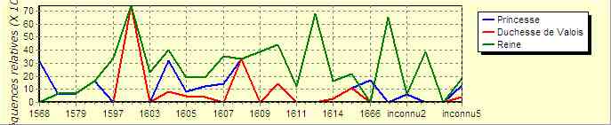 Grazie a quest’opzione, si può visualizzare l’utilizzo di una parola e la sua evoluzione nel tempo. L’ho utilizzata per fare degli “zoom” precisi su certi oggetti in modo molto efficace. Si verifica però un problema metodologico se non si è fatta una AFC per identificare la parola che si vuole studiare. Ecco un diagramma ottenuto con Lexico3. Si trattava di capire come variasse l’uso del titolo «Princesse», «Duchesse de Valois» et «Reine» nel corso del tempo. Ho quindi chiesto al software di costruire questo diagramma, che ho potuto interpretare sul piano politico mettendolo in parallelo con le date più importanti della vita di Margherita di Valois: