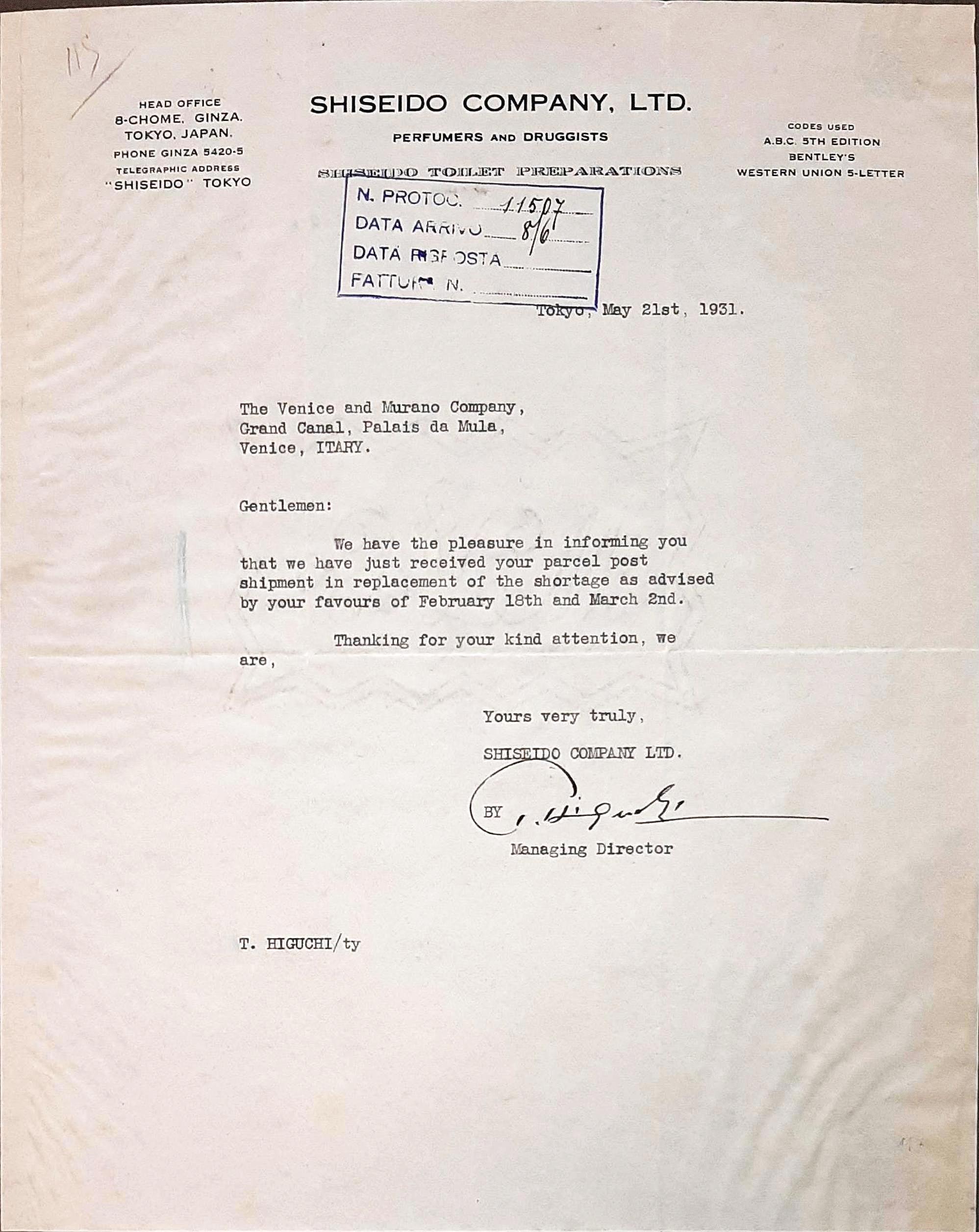 3/ Lettera della Shiseido Company Ltd. per la ricezione di sostituzione di merce acquistata dalla Compagnia Venezia Murano, in Fondazione Giorgio Cini, Archivio Pauly&C.-CVM, Libro d’Oro CVM, I, p. 45, n. 135 (21 maggio 1931).