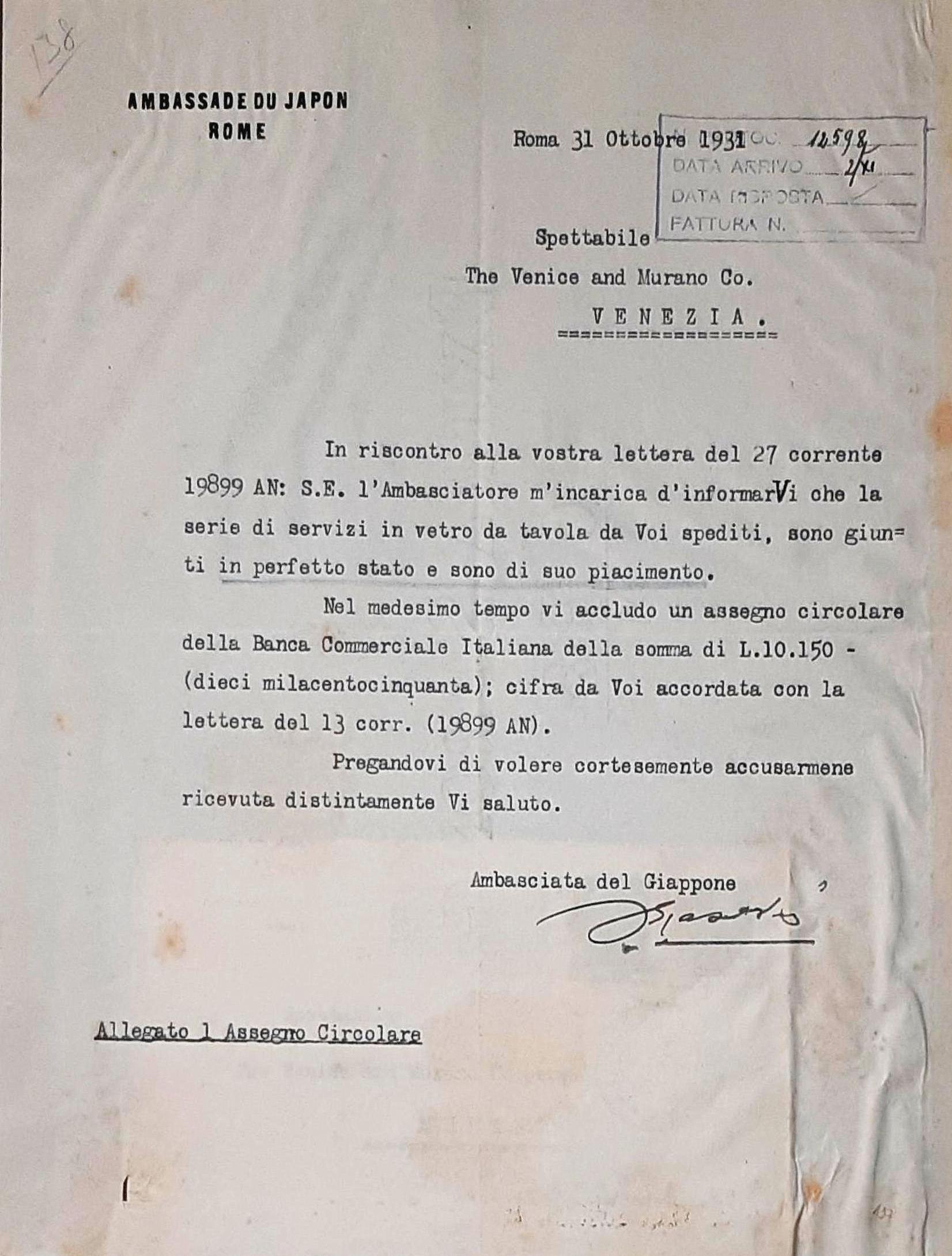 4/ Lettera dell’ambasciata giapponese a Roma che informa della ricezione della merce acquistata dalla Compagnia Venezia Murano, in Fondazione Giorgio Cini, Archivio Pauly&C.-CVM, Libro d’Oro CVM, I, p. 49, n. 138 (31 ottobre 1931).