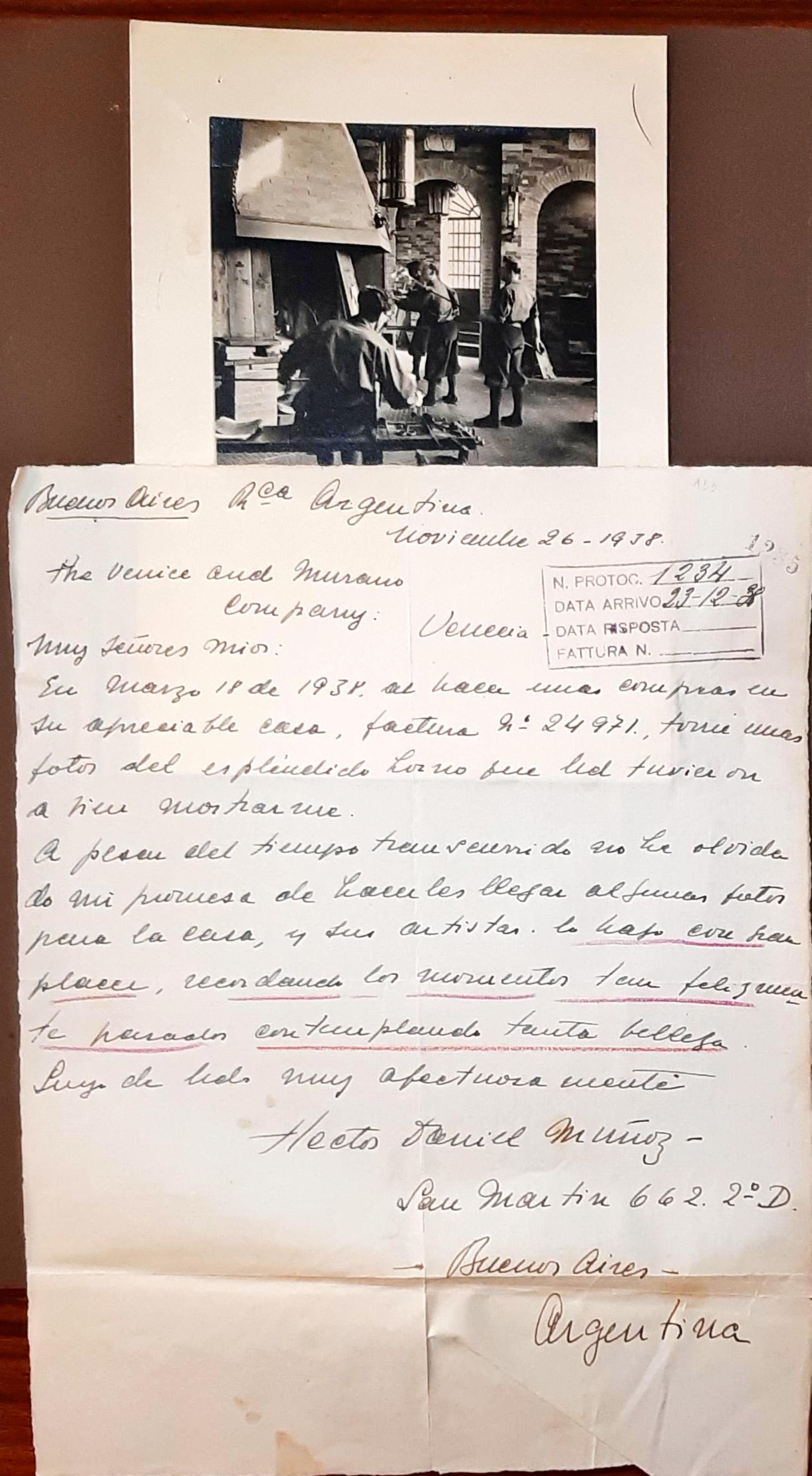 7/ Lettera di ringraziamento del signor Hector Daniel Muñoz alla Compagnia Venezia Murano, corredata di una foto da lui scattata durante la dimostrazione presso la fornace di Palazzo Barbarigo, in Fondazione Giorgio Cini, Archivio Pauly&C.-CVM, Libro d’Oro CVM, II, p. 59, n. 135 (26 novembre 1938).