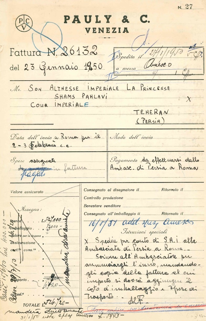 9/ Fascicolo di fatturazione per acquisto effettuato dalla principessa di Persia Shams Pahlavi, in Fondazione Giorgio Cini, Archivio Pauly&C.-CVM, Fatture, n. 26132 (23 gennaio 1950).