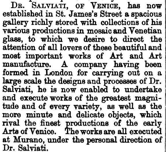 1/ Notizia dell’apertura del negozio della Salviati&Co. a St. James’s Street a Londra, in «The Art Journal», 1868, p. 18.