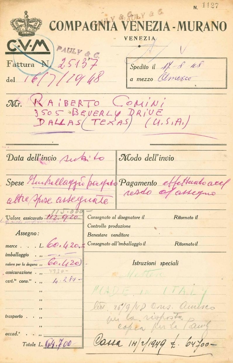 9/ Frontespizio di fascicolo di fatturazione, in cui fra le note di specifica di inserire la dicitura “Made in Italy”, in Fondazione Giorgio Cini, Archivio Pauly&C.-CVM, Fatture, n. 25137 (17 agosto 1948).