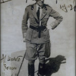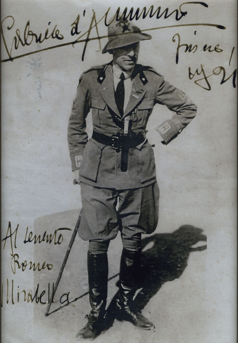 Si tratta di uno scatto realizzato a Fiume, forse nell’estate del 1920, in cui D’Annunzio indossa impeccabilmente uniforme e stivali. Il Vate è ripreso da un’angolatura alta, in una giornata soleggiata che provoca la striscia scura che gli avvolge la faccia. Lo sfondo, completamente bianco, è frutto di uno scontorno del fotogramma originale che isola la figura del comandante dalla scena, nella quale comparivano, alle sue spalle, degli atleti radunati per una gara ginnica, e al suo fianco il generale Ceccherini. Quest’operazione ha eliminato le principali informazioni di contesto, rendendo la fotografia adatta alla riproduzione in molti esemplari, tanto da essere usata da D’Annunzio per inviare saluti e dediche ad amici e compagni, come si deduce dalla firma e dalla data del 1921 impresse sulla stampa donata in copia dalla famiglia Mirabella al Comune di Ronchi. Trasformata nel 1923 in cartolina, con la didascalia «GABRIELE D’ANNUNZIO», dall’editore di Fiume Francesco Slocovich, l’illustrazione ha avuto larga diffuzione ed è reperibile in diverse pubblicazioni. Da un’istantanea in bianco e nero, di scarso impatto rispetto ad altre appartenenti all’immaginario dannunziano, Cobelli ha creato uno spettacolo mosso, colorato, colmo di riferimenti, benché di fattura non eccelsa.