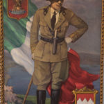 L’opera celebra Gabriele D’Annunzio in divisa, che domina il golfo del Quarnaro alle sue spalle. Il volto è coperto dall’ombra della tesa del cappello, il pungno è poggiato a riposo sul fianco sinistro, la mano destra stringe l’impugnatura di un bastone. Non è raffigurato il condottiero eroico che arringa la folla o i soldati. Se non lo si rionoscesse, lo si potrebbe scambiare per un anonimo ufficiale in là con gli anni. A dare spessore al tutto intervengono però degli elementi che l’artista attinge dal campionario iconografico del patriottismo: la bandiera italiana, che fa da quasi mantello agitato dal vento, e poi gli stemmi di Fiume in alto a sinistra e di Ronchi in basso a destra. L’emblema fiumano è riportato nella versione con l’aquila a una sola testa, in sostituzione di quella bicefala asburgica che vi campeggiava in origine, assumendo così una chiara connotazione politica. Lo stemma del Comune di Ronchi è costituito da uno scudo rosso, attraversato da tre monti e, in primo piano, quattro viti su un prato verde. L’uomo, il panorama, le insegne: l’osservatore si trova di fronte a simboli visivi ricchi di risvolti e in attesa di decifrazione. Mentre i due stemmi rimandano ai destini legati delle città di Fiume e di Ronchi, con al centro il poeta a fare da nesso ideale, il modo in cui questi è rappresentato risulta controverso. Perché l’autore ha scelto un D’Annunzio in atteggiamento così poco valoroso, coi lineamenti seminascosti? A svelare l’enigma soccorre la fotografia che ha funto da modello, meno fiacca, in un particolare almeno, rispetto al calco pittorico, poiché vi si scorge il vigile occhio dello scrittore abruzzese sbucare dall’ombreggiatura del berretto.