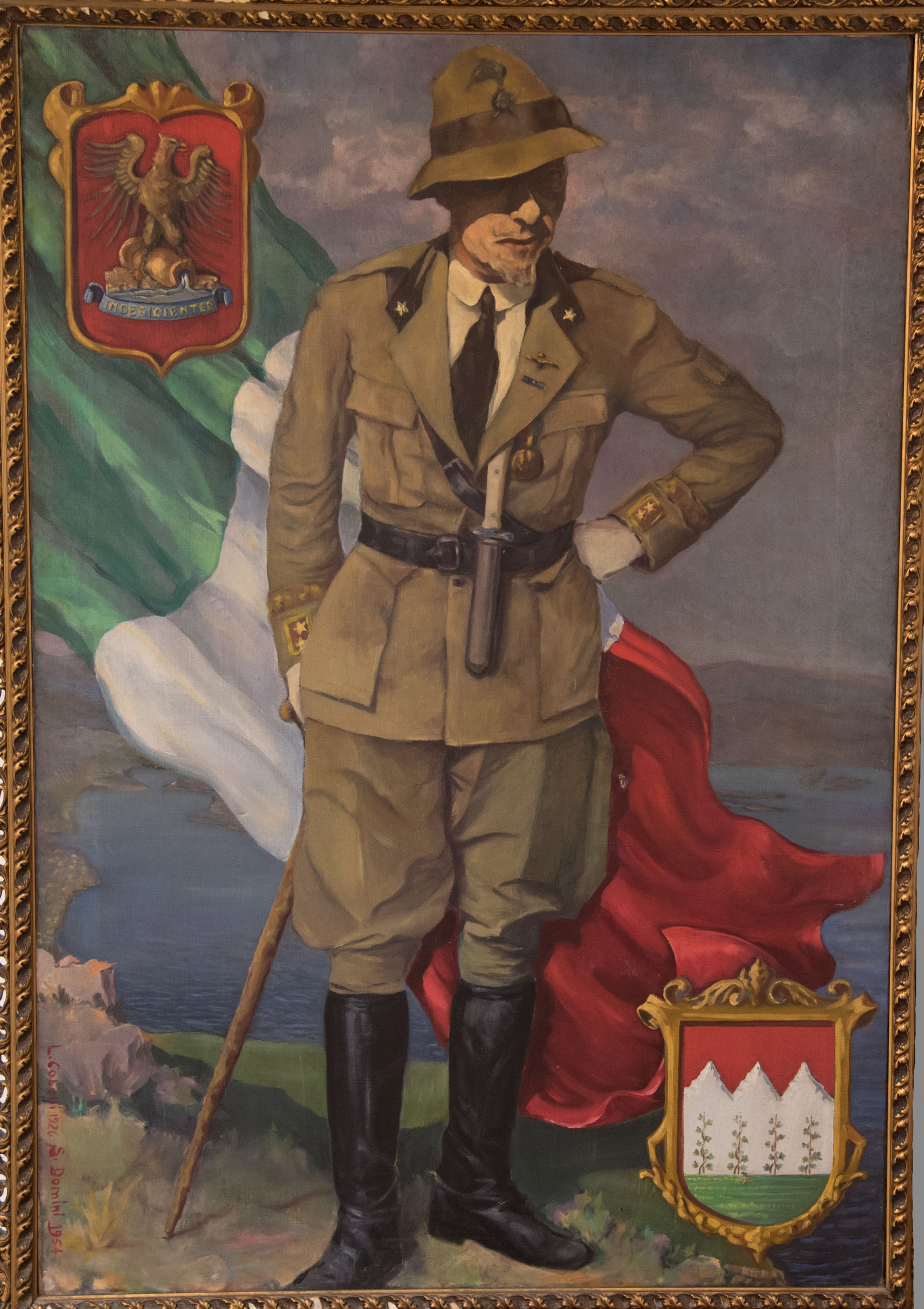 Le fonti visive sono, in apparenza, quelle che trasmettono in modo più diretto e imparziale i significati, sebbene anch’esse siano in grado di renderli ambigui o modificarli. L’esempio qui presentato dimostra che ogni immagine, al pari di ogni tipo di doumento, necessita di un attento sguardo critico. Con Regio Decreto n.2009, datato 2 novembre 1925, Ronchi prende il nome di Ronchi dei Legionari. Per l’occasione, l’amministrazione comunale commissiona un quadro celebrativo al pittore fiumano Luigi Cobelli. Posto nella sala del Consiglio, il dipinto vi rimane fin poco oltre la Seconda guerra mondiale, quando è rimosso e depositato in magazzino. Rovinatosi nel periodo di disuso, nel 1956 viene recuperato e affidato al restauro di Silvio Domini.