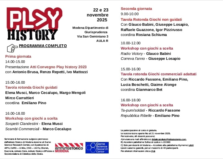Seminario di formazione sul gioco promosso dall’Istituto storico di Modena insieme al Game Science Research Center con il patrocinio di AIPH, CeRG – Università di Genova, CSG – Università di Torino, Clionet, Diacronie. Studi di Storia contemporanea, Istituto storico di Pistoia, Istituto Cervi, Società italiana di didattica della storia.